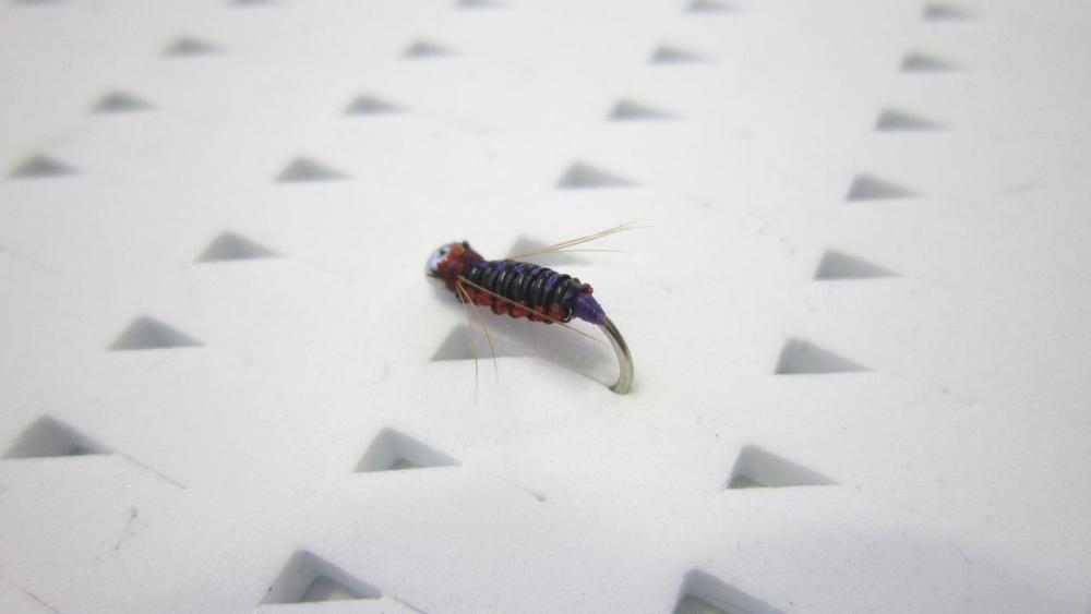 Использованы следующие материалы: крюк Чину-Ринг 0.8; тело черный винилриб, швейная бордовая нить; монтажные нити UNI 6/0 purple, wine; люрекс Veevus и рыжий петух.
