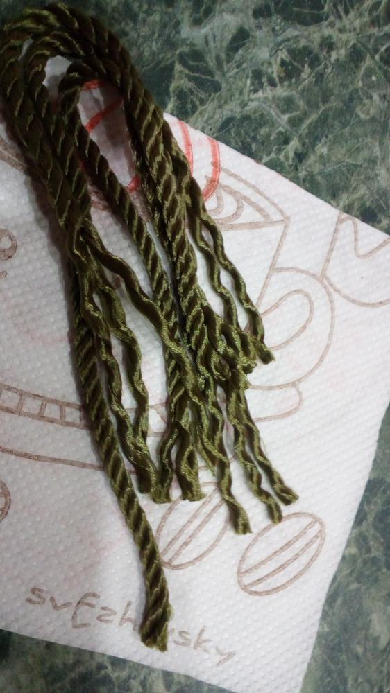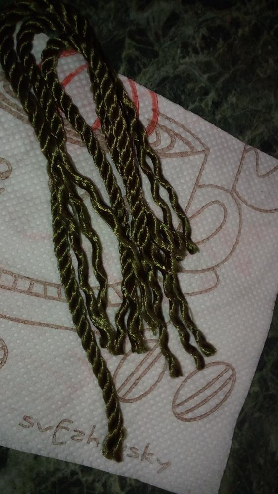 Цвет похож на ацетатный шелк черноресенский олива, только нитка крепче, так не рвётся. Может сейчас фотка лучше получилась