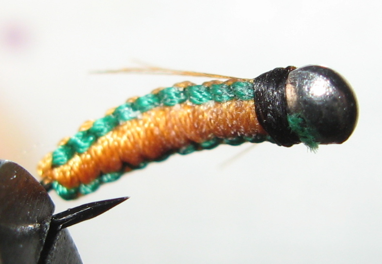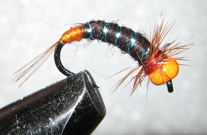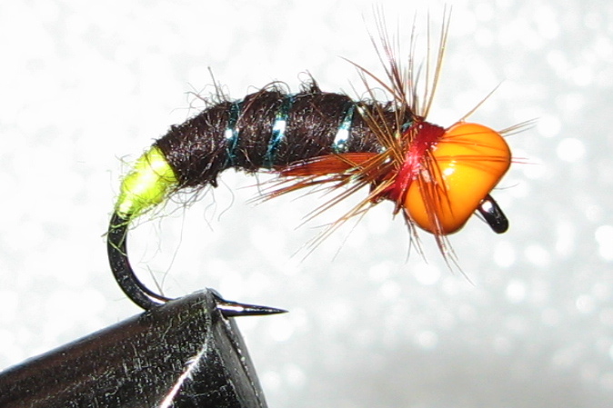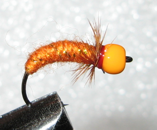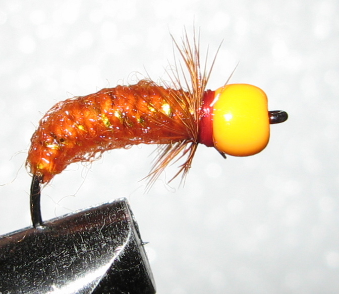 муха Оранжистка, крюк сасими вормер 4 нумер, тушка сформирована черным капроном, скрутка оранжевая шерсть(2 нитки) с желтым люром из елочной игрушки, бошка рэдюни 8, перо рыжее, бусина оранжевая 4 мм стекло Чехия. Сухая и мокрая.