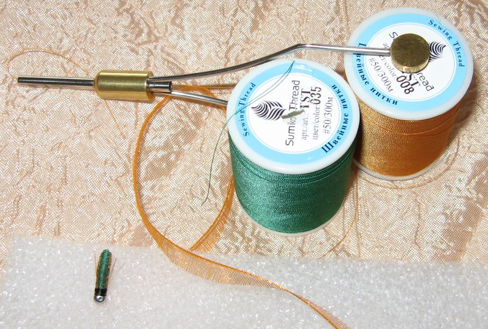 Затарился немного новыми нитками, попробовал из них сваять плетёночку. Тушка из оранжевой, плетение в 4 нити, крылышки из ровницы органзы.