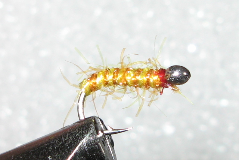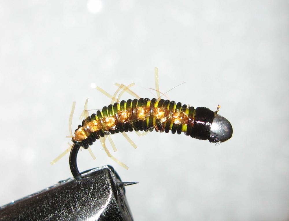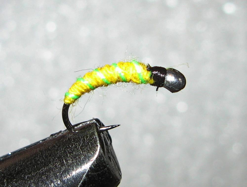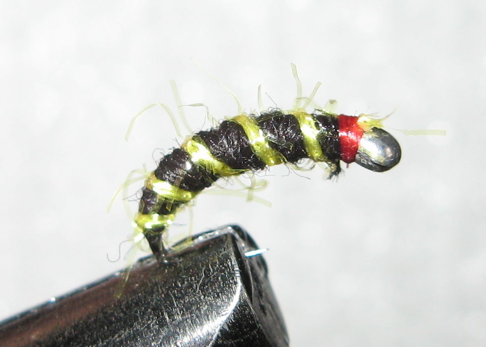 Оторвал лампасницу... Надо новую вязать. Зато навязал на пробу таких, одна черная с промоткой жёлтой лохмашкой, другая-две лохмашки в спиральной укладке. Чёрная по Юриной технологии, беспёрая, да и вторая тоже, там лохматости с избытком. Надо мочить.