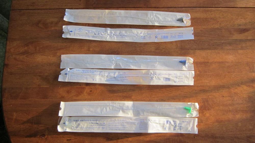 Так сказать нарыл в закромах "зонды питательные" или катетеры, у меня нашлись в трех размерах, под номерами: 6, 8, 10. Наименьший размер 6-й (нижний на фото). По боку трубок идет голубая (синяя) тонкая полоска. 6-ые и 8-ые номера катетеров имеют прозрачные трубки, 10-й номер матовую трубку. Трубки не надо тянуть, можно сказать они и так готовы к окраске...