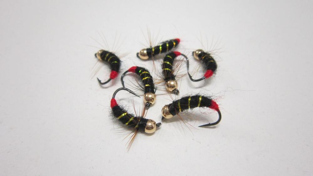 Крюк Hayabusa fly 384 №10, огрузка латунная головка 3.4мм, тело черная шерсть, жопка красная шерсть, сегментация желтый люрекс голографик, ершик рыжее перо петуха, черная монтажная нить Veevus 8/0.