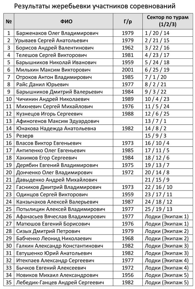 09-00 Старт турнира. По сигналу – участники входят в сектора согласно номеров полученных в процессе жеребьевки, В секторе участники начинают подготовку снастей и затем лов рыбы.