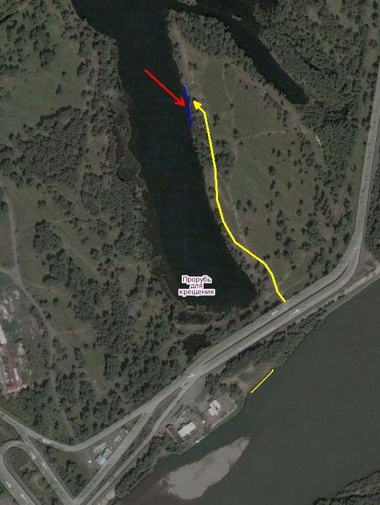 Был там в понедельник вечером, съезд с дамбы и проезд нормальный, легковушки проезжают. А вот съезд, проезд вдоль берега на противоположный берег в углу дрены у дамбы перекопан (к месту где купаются на Крещение). Ниже схема проезда к месту сбора указано желтой кривой линией