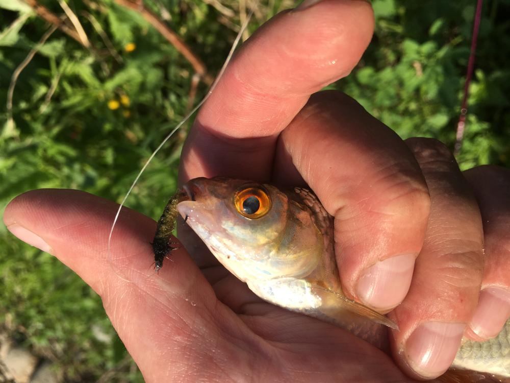 Не совсем нахлыст, но всё же)) Сегодня провел эксперимент по ловле рыбы на свои нахлыстовые нимфы. Конечно даже для наноджига нимфы были легковаты, но результат был, чему я очень рад!