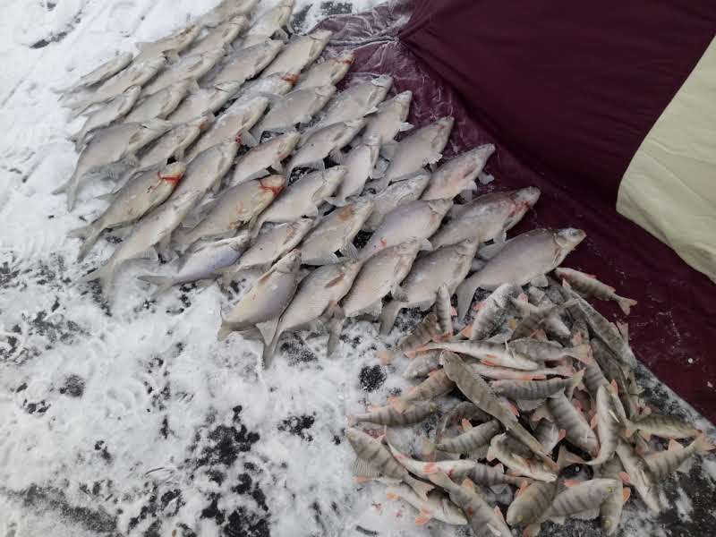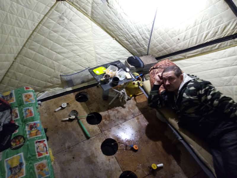 Поехали с утречка, прибыли на место, провели "разведку" на местности (эхолотом, через лед). Выбрали примерное место, забурились, поймали по окуню и тишина. Напарник махнул в глубь моря, искать протоку, что от Турана идет, я продолжил "разведку", нашел канаву, перепад с 12-ти на 14. Рядом был рыбак, нашел он окуневую лунку, на блесну ловко ловил. Напарник мой прибежал с горящими глазами - "Нашел протоку!!!", перепад с 12-ти на 15 метров, течение. Приволокли шмутьё туда, поставили палатку. Половили окуня хорошо, как стемнело - окуневый клев стих.. начался клев лещевый! Попалось даже парочка налимов. Клевало постоянно, не спешно - давая время на: перевязать мормыхи, перекусить, закусить. Ночью словили десяток окуней. Как рассвело, переключились на ловлю окуня. Окунь клевал и лещ клевал. До обеда просидели, собрались и поехали домой.