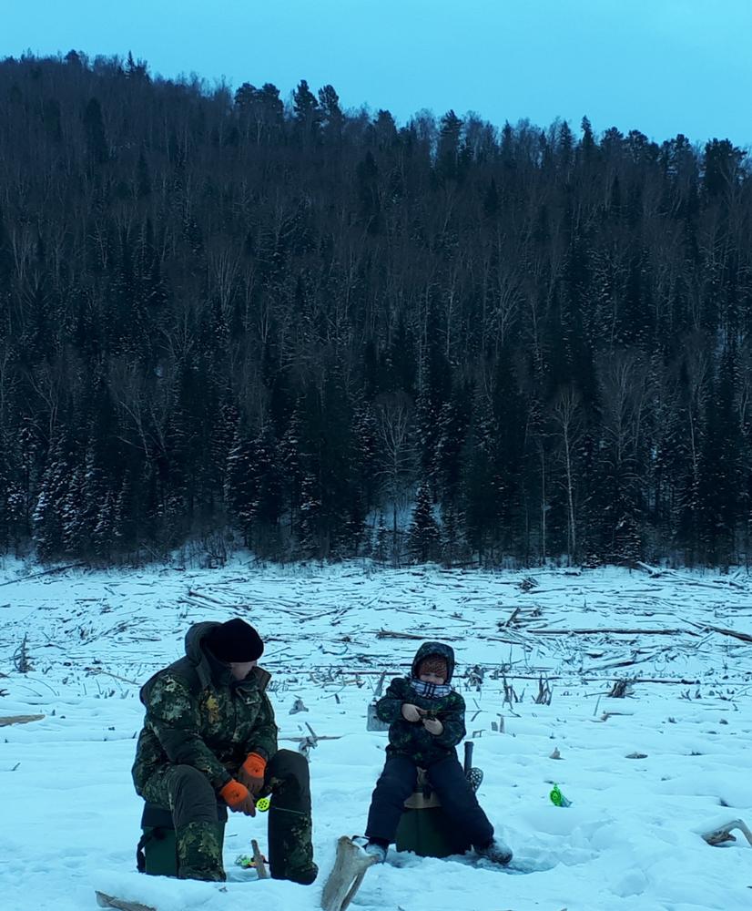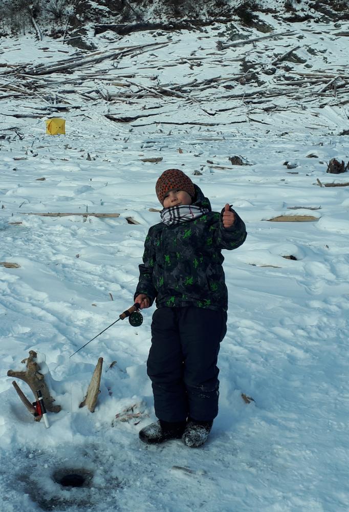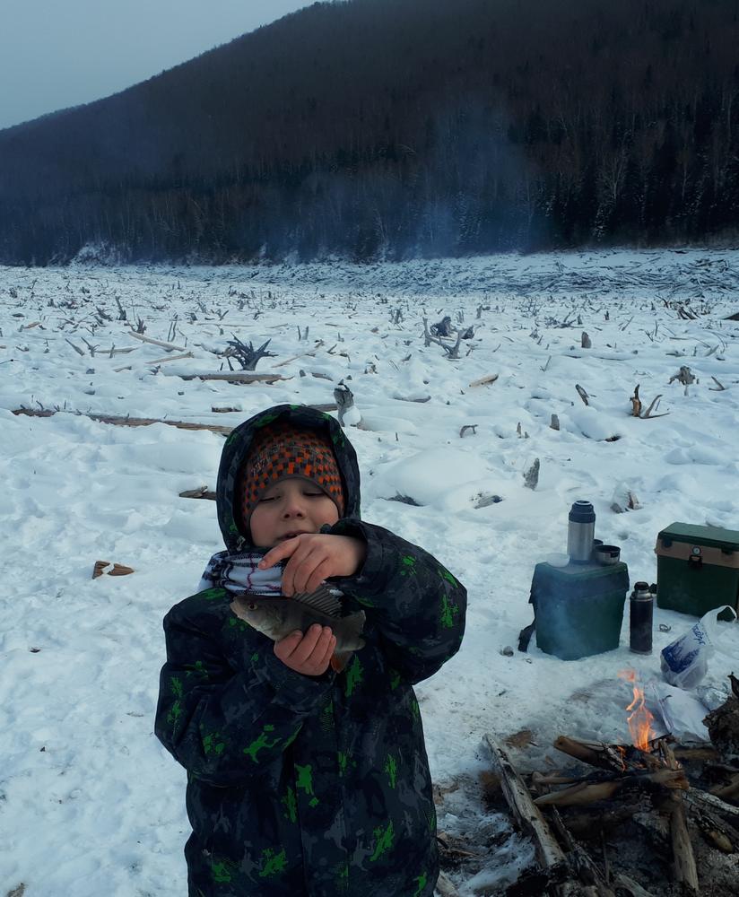 Рыбачёк молодец, даже без рукавиц рыбалит.)