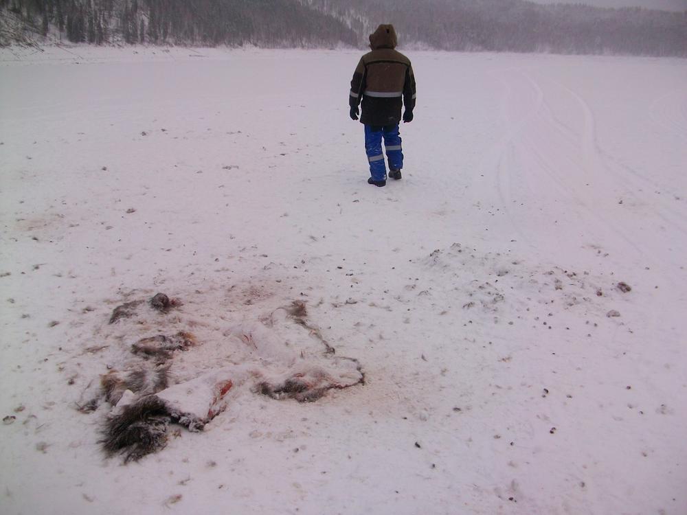 В заливе волки задрали марала, от него уже ничего не осталось, вОроны, доедают.