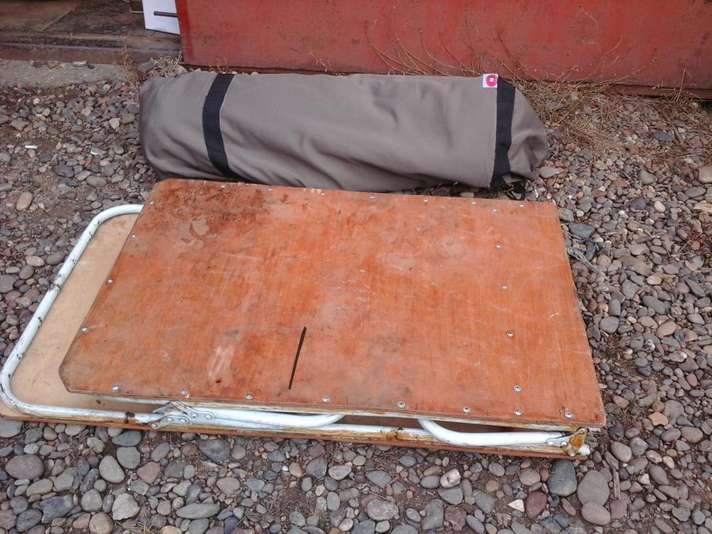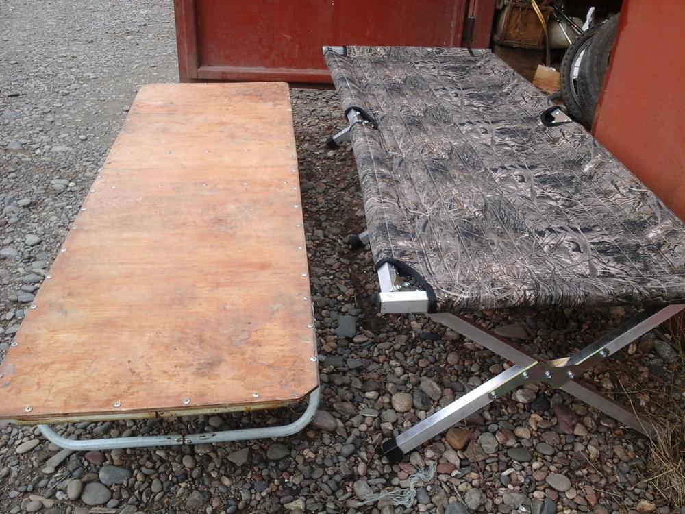 С morfiy полностью согласен по фанерной. Сейчас пользую другую раскладуху "Медведь" из алюминевого профиля, компактно складывается,утеплённая ткань.
