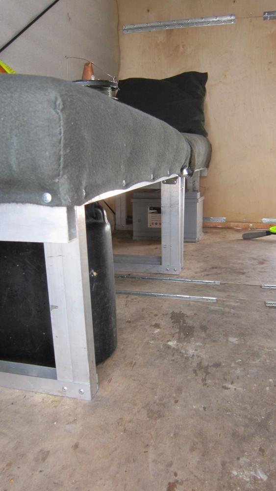 Добрался до своего раскладного диванчика, изготовил пару сезонов назад из того что было (фанера, дюралевая профтруба, петлевые шарниры, паралон, ткать, петлевые защелки и тд.). Можно было изготовить немного тоньше, но тогда бы ножки не умещались бы в сложенном виде в длину, ранее диванчик был немного высоковат, спина стала уставать, позже ножки укоротил так сказать для достижения оптимальной высоты диванчика (под себя) и дополнительного размещения под диванчиком различных вещей...