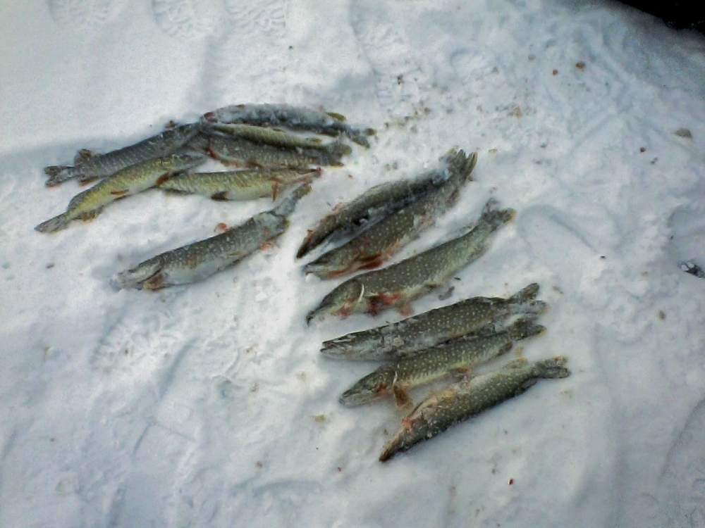 Как говорится, давно не брал я жерлицы в руки.;-). Далеко решил не кататься, поехал на ближайшей пруд села Московское. Толщена льда примерно 120-130см., для мотобура в принципе не страшно.;-) Ну что сказать рыбка есть, правда мелковатая от 200г до 1.5кг но за то много. Флаги загорались с утра, пришлось побегать. После 12:00 полнейшее затишье примерно до 15:30 ( это я про поклёвки).зато подул сильный ветер. После 16:00 флаги сошли с ума загорались через каждые 10-15 минт и началась беготня.:-) Рыбки от 200г до 600г были отпущены, акрамя одной, забыл её в ведре с живцом, хотел перенести в другую лунку.. В общем рыбалкой остался доволен.