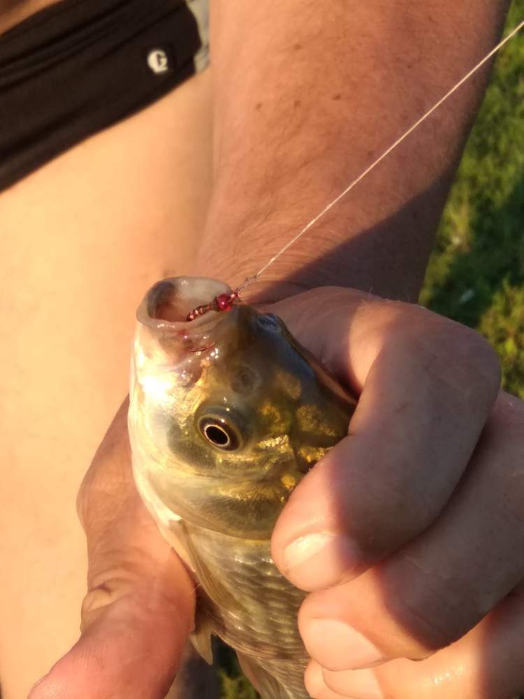 Вечером после работы с супругой сгоняли на Калининский карьер, накупались, и я решил порезинить, но оторвал офсет на первом же забросе. И перешёл на сбиро, оно не подвело, сел на кебари отличный карасик. Вечер удался по полной, первый карась на муху!