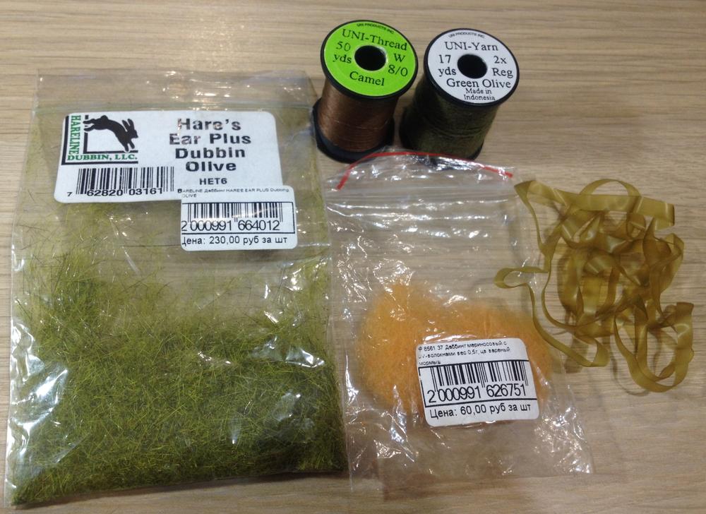Леха привет! Вот основный материалы. Подслой из юни-ярновской шерсти грин олива, смесь дабингов (олива и вареный мормыш), пленка лавр от ЧР, голова коричневая монтажка. Ну и там еще есть перо петуха на хвостик, леска для сегментации, оранжевая шерсть для пятнышка на спинке и короткий кусочек милиметровой гаммы по спинке для придания горбатости ... в общем надо как-то собраться и пошаговку сделать )))