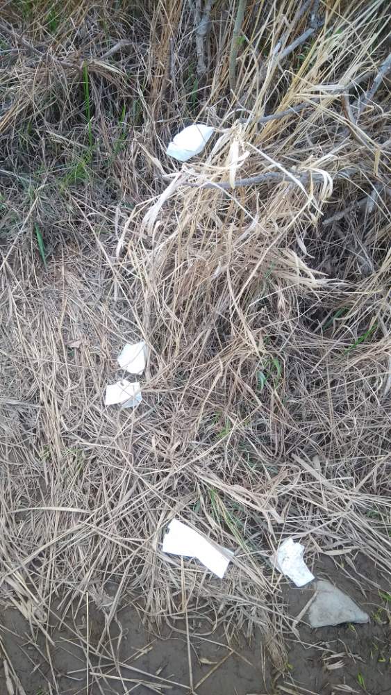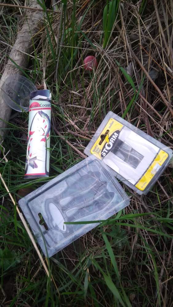 Из нового: остатки скотча, гандон, кусок сетки (видимо от телевизора), упаковки от блесен и резины, влажные салфетки б/у, пустая бутылка от пива, пакет.