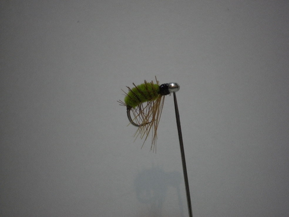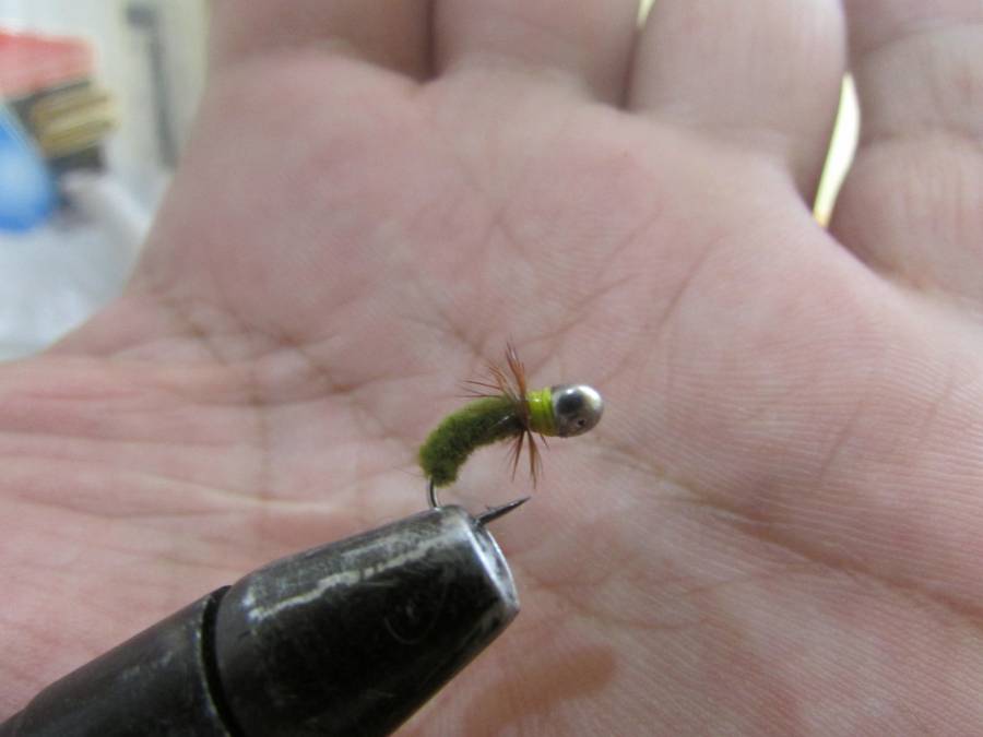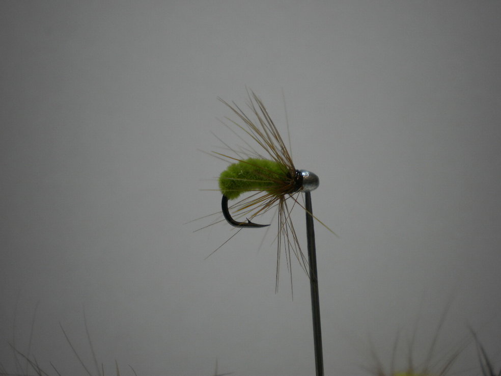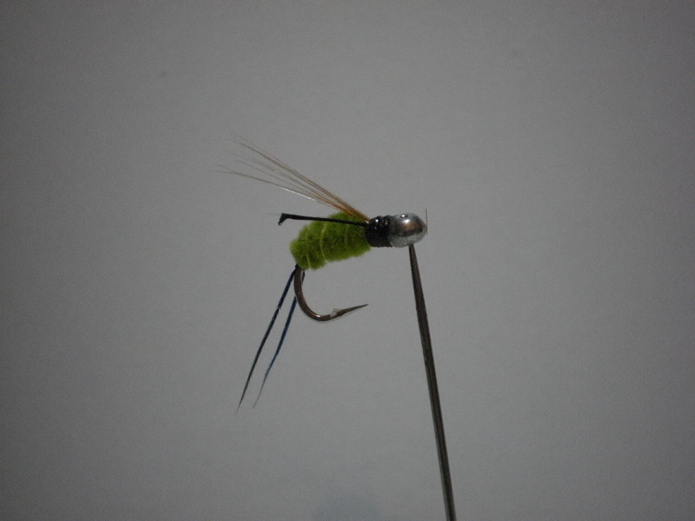 Сам этот материал, я помню, подсмотрел на старой кладовке в лохматых годах еще. У самого кладовщика была муха "рекордная" из этой зеленой микросинели, но она была с оранжевой жопой. Он даже какие то соревы выигрывал этой мухой.