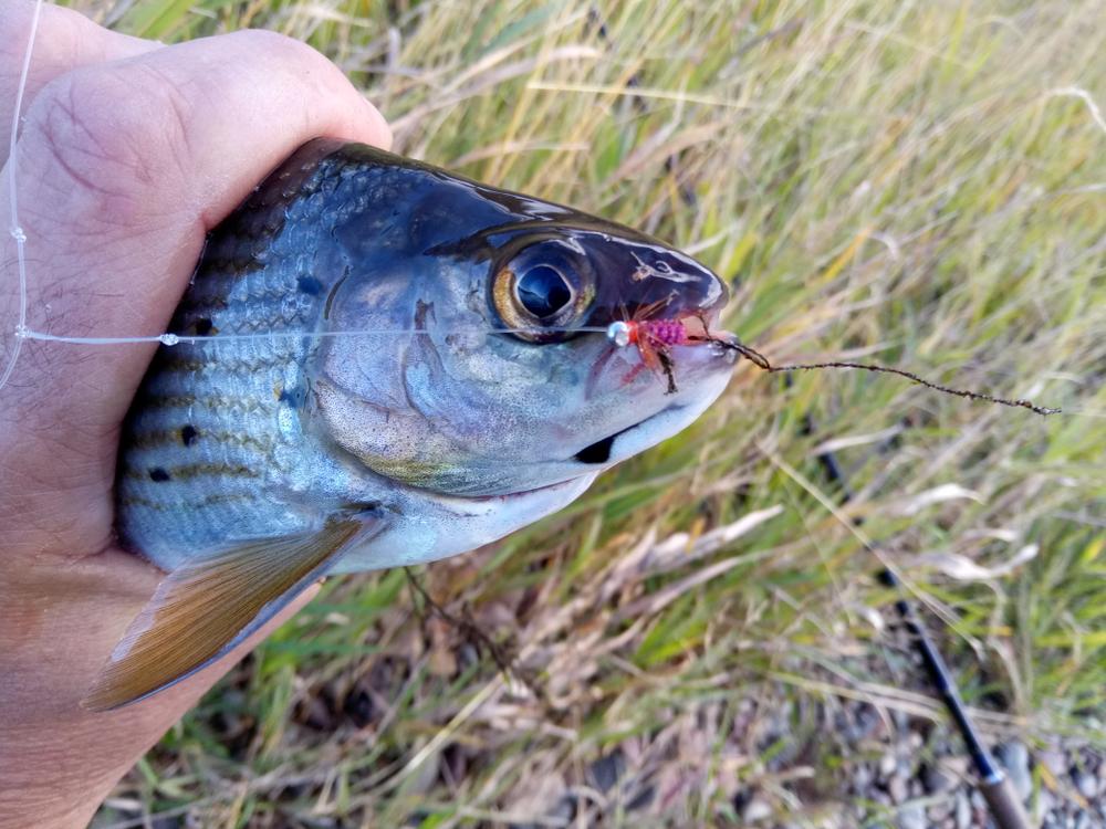Всем привет!Сегодня с Серегой покидали до обеда на Енисее пару часиков а потом нас чуть не сдуло! Муха та же,на напайке работает не хуже.Вода подпрыгнула здорово,травища достала !!!