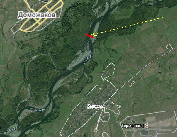Осенью переправа была тут (красным указана сама переправа, желтой стрелкой место)