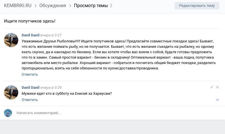 Данил у нас в ВК просится что бы взяли на рыбалку. Если кто поедет может возьмете его? Обещает тепло одеваться.