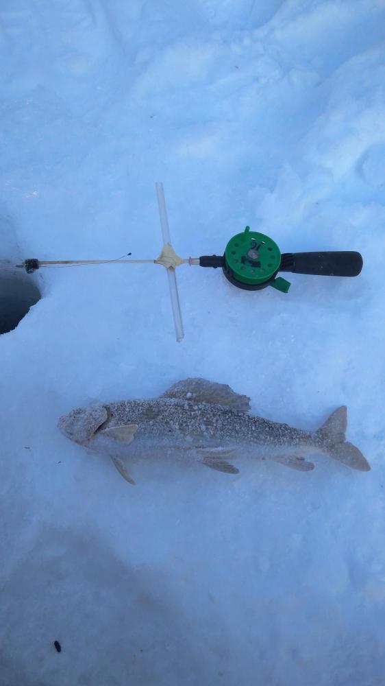 Бурю рядом еще одну лунку. В нее вторую удилку с мухами. Через 10 минут на нее поклевка - ребенок :cry: на ЖД флажок. Отпускаем!