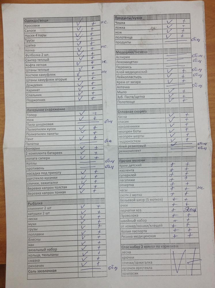 Все привет! Вчера разбирал вещи и нашел одну раритетную штуку! Список сбора на многодневный сплав (по всей видимости Кантегир, 2004, сплав на катамаранах, 11 дней). Очень полезно, чтобы ничего не забыть, пользуюсь таким способом по сей день. Сбор в два этапа: первый, набираю все по списку и раскладываю по кучкам, отмечаю. Второй: при упаковке всего этого барахла в гермомешок и рюкзак, так же, уложил-поставил галочку.