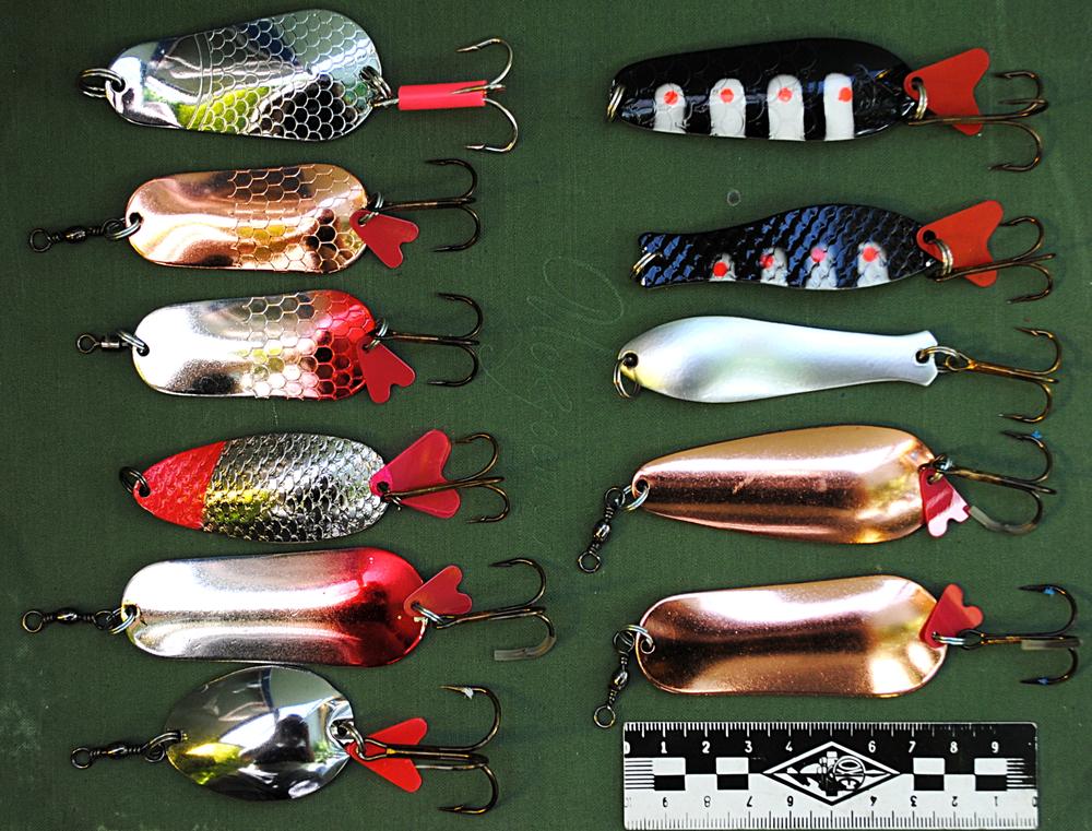 Лепестки были от китайских Мепсов первого номера. В составе блесен не работали, а в спинерах на ура. Фото нет, да и спинеров уже года два тоже. Опишу в двух словах. Коромысло было из обмедненной сварочной проволоки диаметром 0,8мм. Верхнее плечо длиной 3 см и через вертлюг с застежкой к нему крепился лепесток. Нижняя часть длиной 4,5-5,0см. На конце сделана застежка, с помощью которой крепится маленькая джиг головка весом 3 - 5 грамм. На головке твистер, или виброхвост длиной в дюйм.