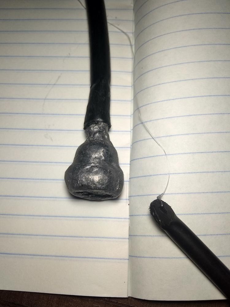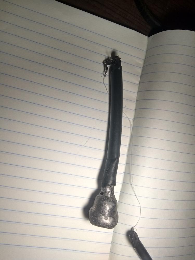 Проба снежанностроения. Несущая проволока из какого-то оптического кабеля (бронеоплётка), корпус из кабеля СИП-16, герметизация клеевым пистолем, заводные кольца и грузики чернореченские соответственно 50 и 40 грамм.