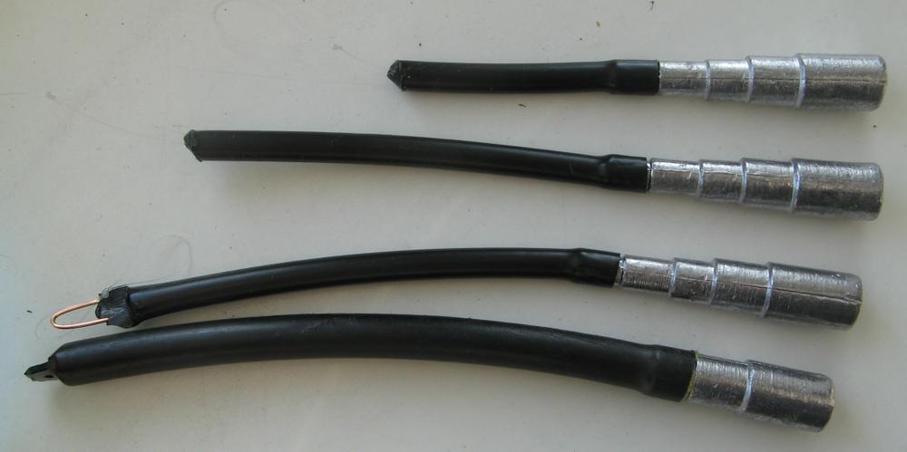 Собрал чуть тиролек из башни 50 грамм в разных типах исполнения. В двух верхних конус сформирован нагревом и охлаждением в формочке согнутой из пивной банки. Затем с несущей проволокой, сверху запаяно прижатием пассатижами, нижняя без несущего элемента, оболочка на 88 клей посажена на груз, верх тоже пассатижами сформирован.