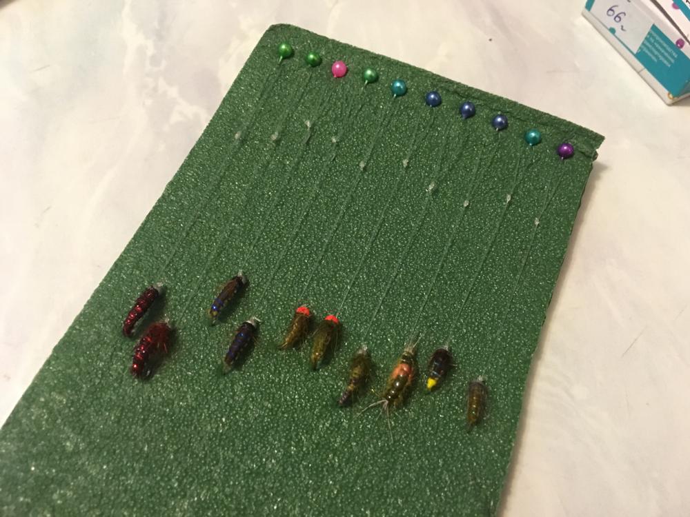 Отрезаем подходящий по размеру кусок старого поджопника из пенки и втыкаем туда булавки как нам удобно , цепляем поводки с мушками