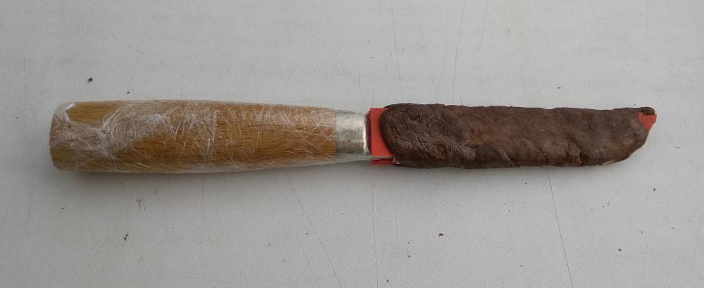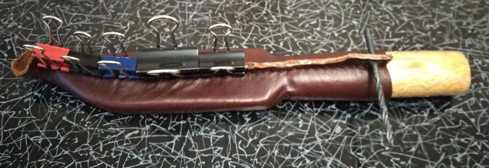 Пришла пора рассказать об изготовлении одежки для Спутника. Задача стояла изготовить ножны максимально бюджетно, по минимуму использовать покупное, по максимуму то, что есть. Т.к. опыта в шитье кожи и ножен нуль, перелопатил кучу сайтов с описанием изготовления ножен финского типа. Туда нужен вкладыш. Попробовал сделать его из пластика + холодная сварка. Результат не впечатлил.