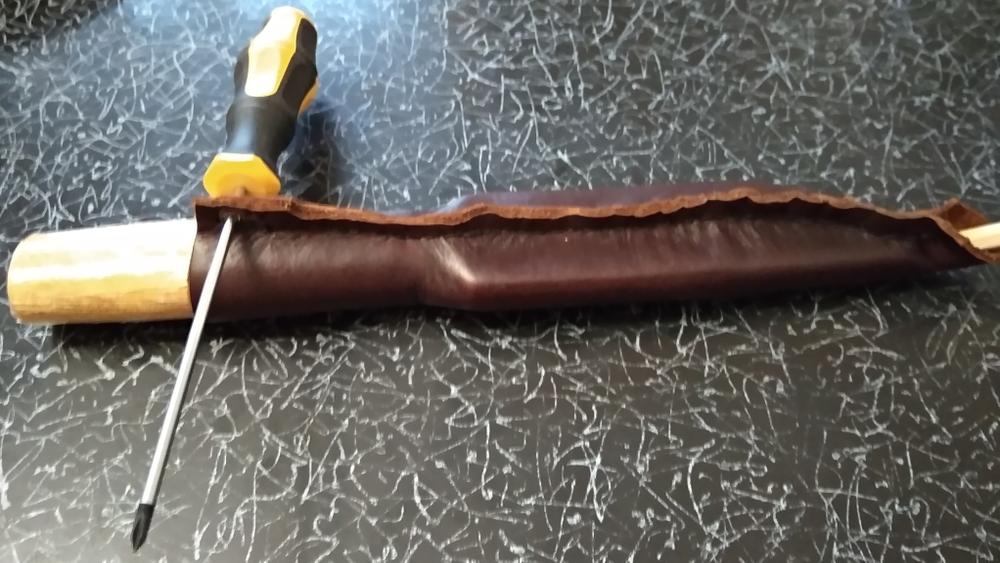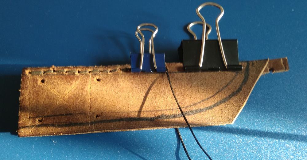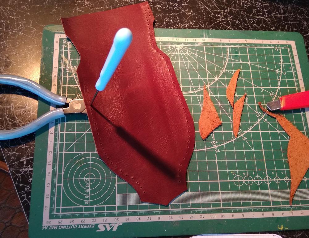 Процесс шитья заснять не удалось, боялся что кожа пересохнет. Для просушки вставлены отвёртка и карандаш.
