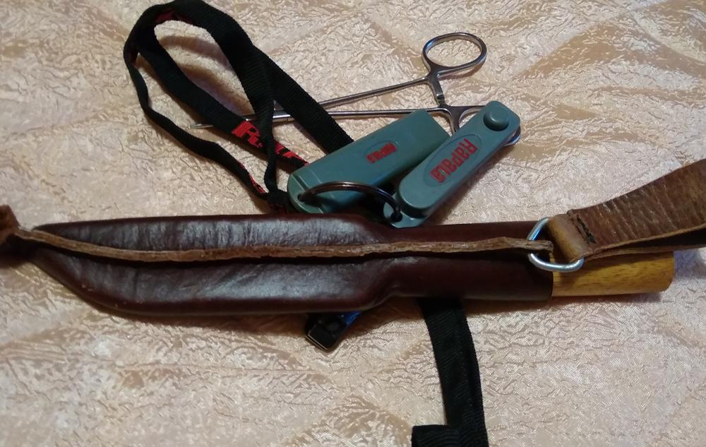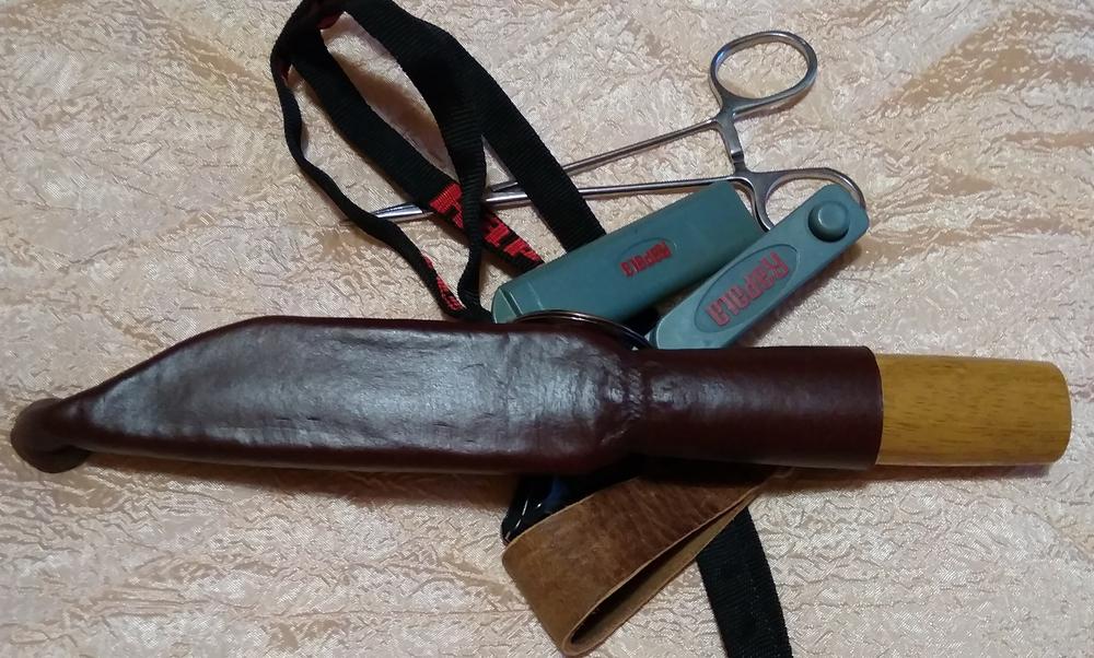 Нож в одёжке с другими рыболовными приблудами с разных сторон.