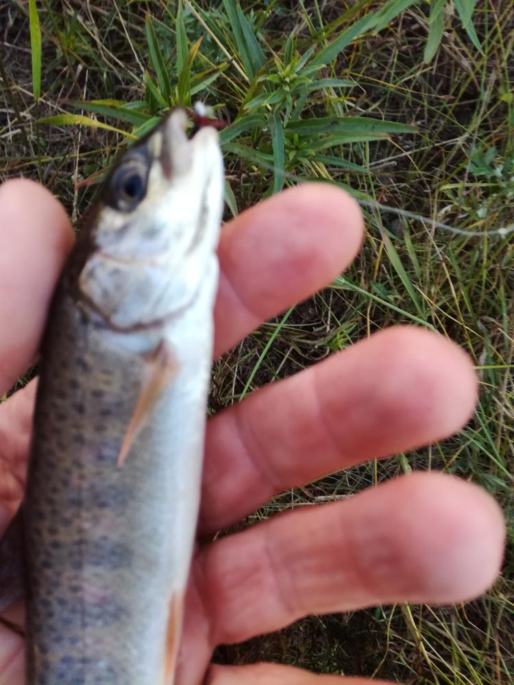 После переехал на баню. Там как-то и плывущего мусора и травы немного поменьше, но рыбалка все равно только против течки. Любой дальний заброс гарантирует приличный пук травы. Так и рыбачил, против течки, да вдоль берега. Мелочи много, но рука не поднимается брать. Уже к темноте все таки забрал четыре штуки более менее товарного размера, так сказать на именинную сковородку. Сегодня работала одна единственная муха, ну и один залетный на кембрик.