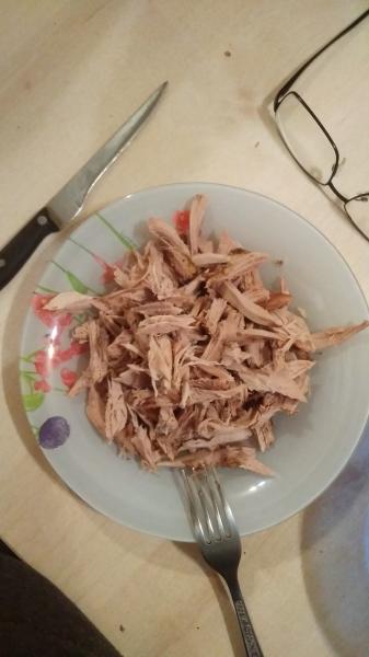 Затем остудил и разобрал на кусочки. Получилось, по моему мнению, достаточно. Целая тарелка.