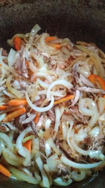 Взял казанок, добавил туда небольшое кол-во постного масла и обжарил лук, морковь и мясо.