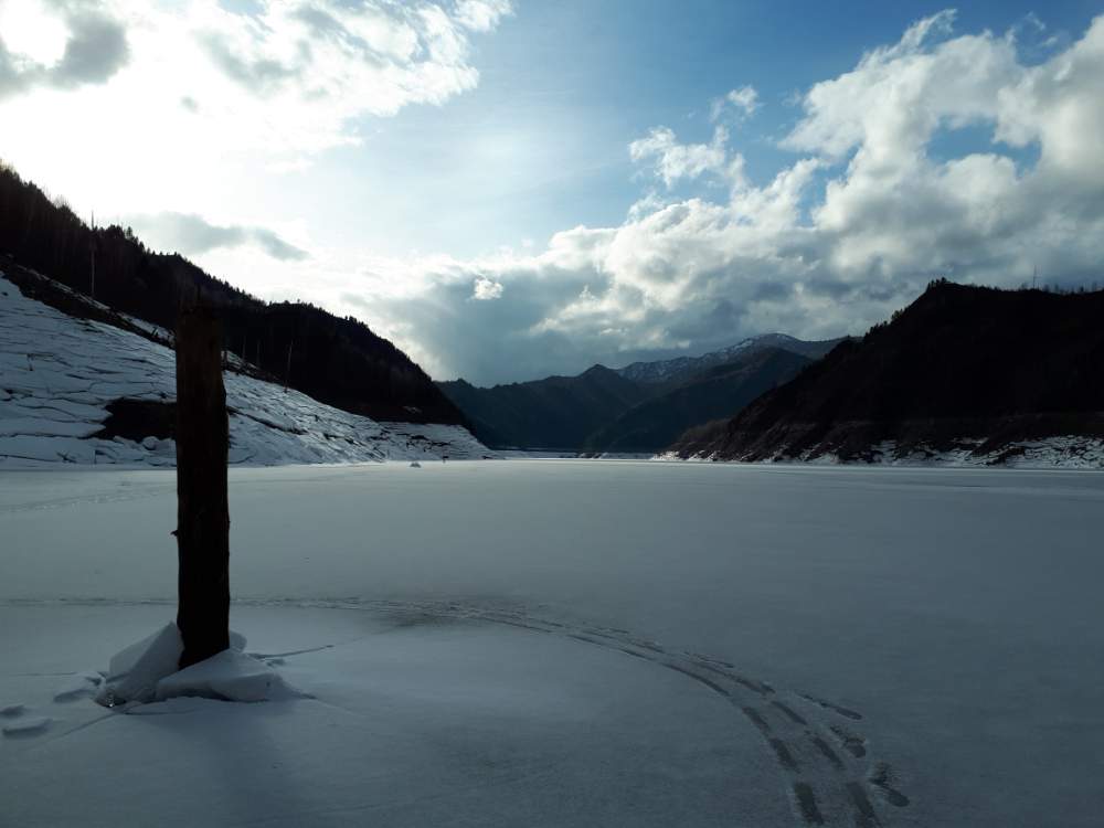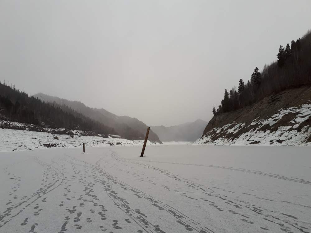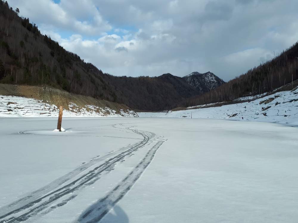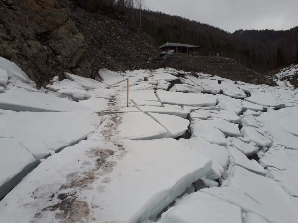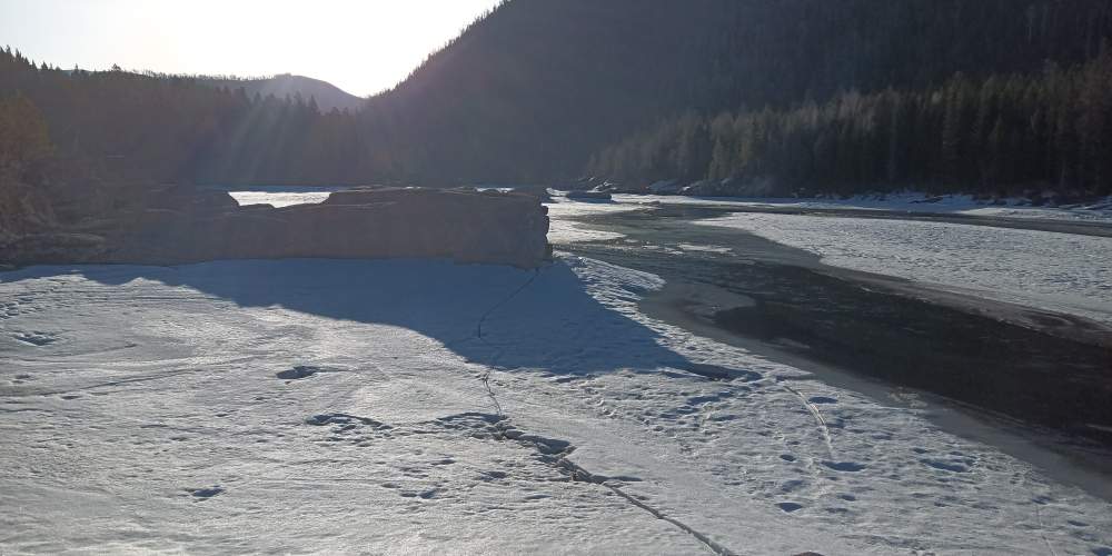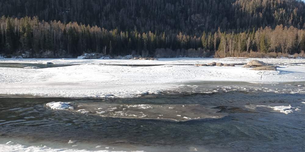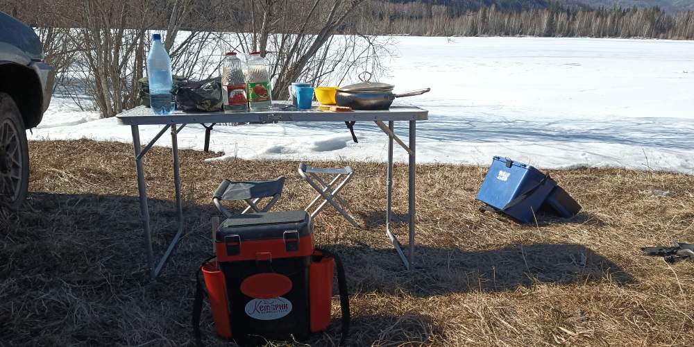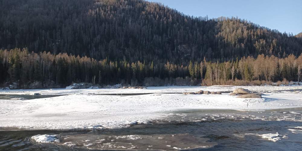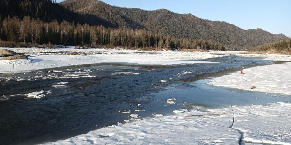 Выехали с Абакана в 12-13:00, 16.04.22., в Кызыле были в 17-18:00. В ночь не поехали. Ночевали у моих родителей. Утром со сранья, часов в 06:00, стартанули до места. Ехать по асфальту км 100-110., дальше тайга, грязь. Погодка хорошая, по дороге, местами видно открытую воду, (брали с собой и длинные удочки, мало ли...) довольно таки большие участки. И чем выше мы продвигаемся- таких участков становится меньше. И вот уже проехали км 110-120 км. И Енисей полность во льду.